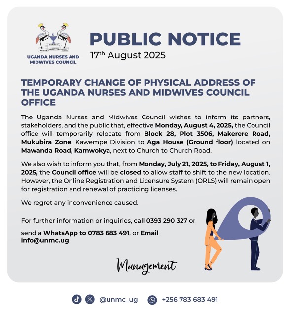 The Uganda Nurses and Midwives Council wishes to inform its partners, stakeholders, and the public that, effective Monday, August 4, 2025, the Council office will temporarily relocate from Block 28, Plot 3506, Makerere Road, Mukubira Zone, Kawempe Division to Aga House (Ground floor) located on Mawanda Road, Kamwokya, next to Church to Church Road.